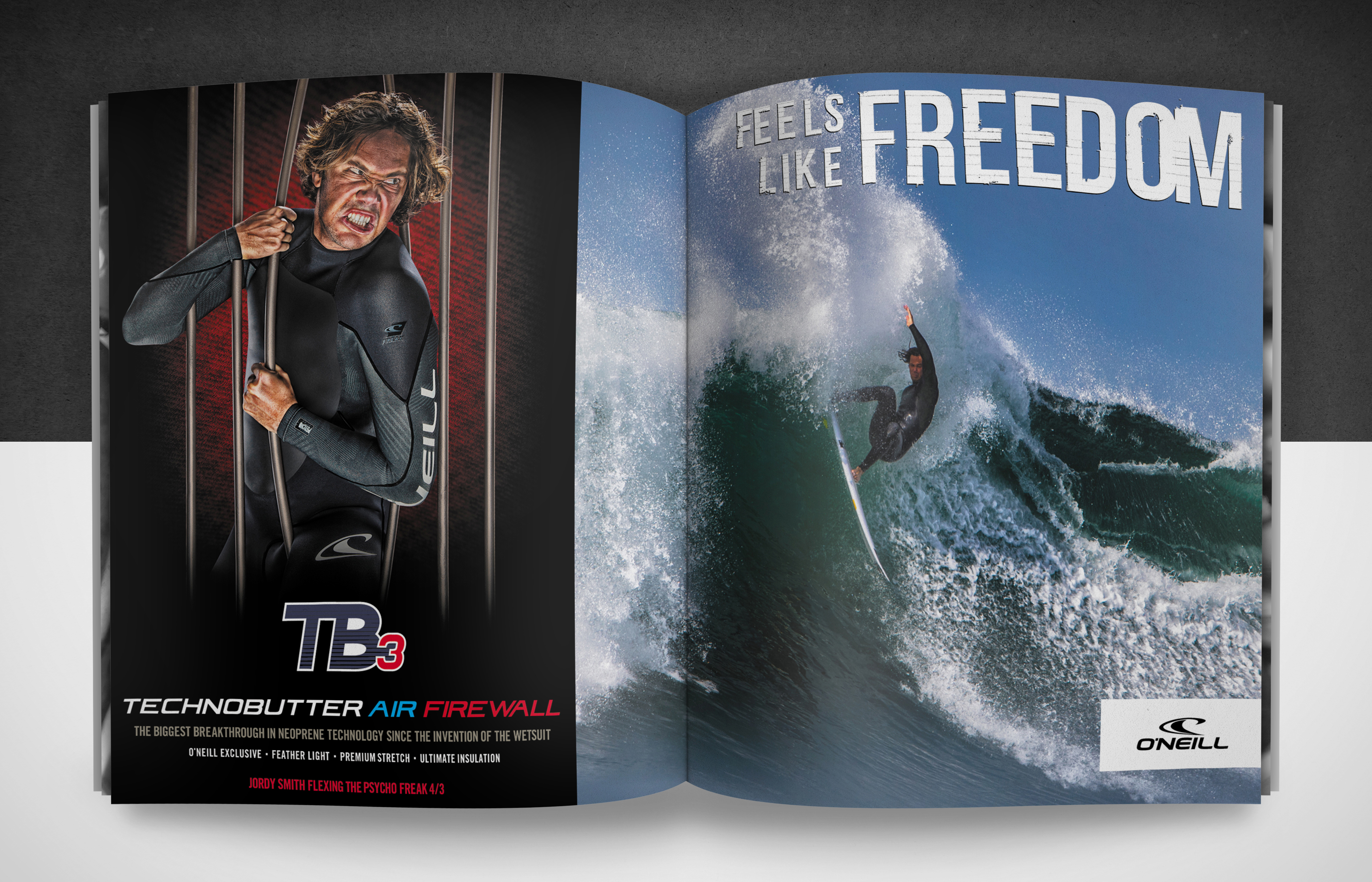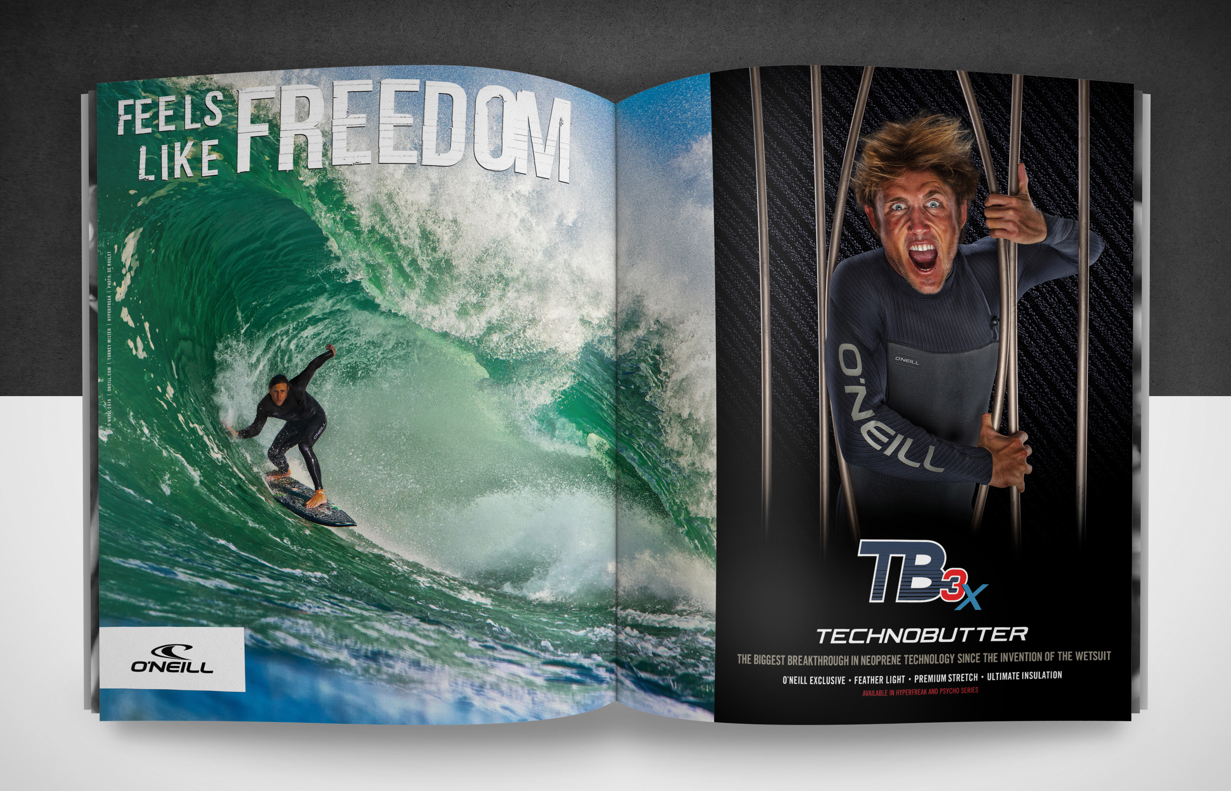 For this marketing campaign, I built' prison bars' out of PVC pipe and directed team riders to scream at the top of their lungs for realistic expressions during in-house photo sessions. The resulting visuals of the need to escape brought the "Feels Like Freedom— TechnoButter 3 Series" concept to life. This campaign ran this impactful imagery in Global Surf Publications, In-Store Point-of-Purchase, Website, and Online Advertising.