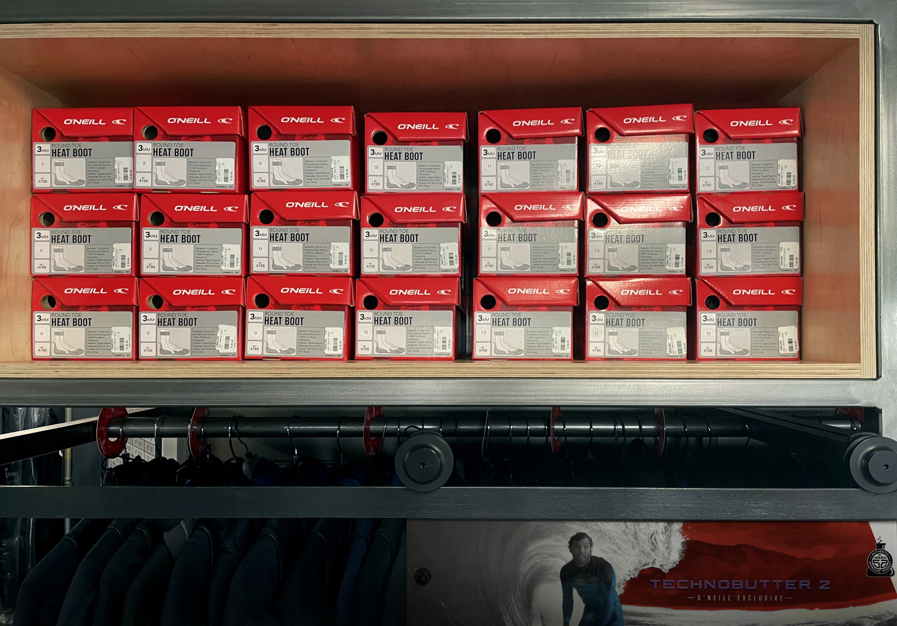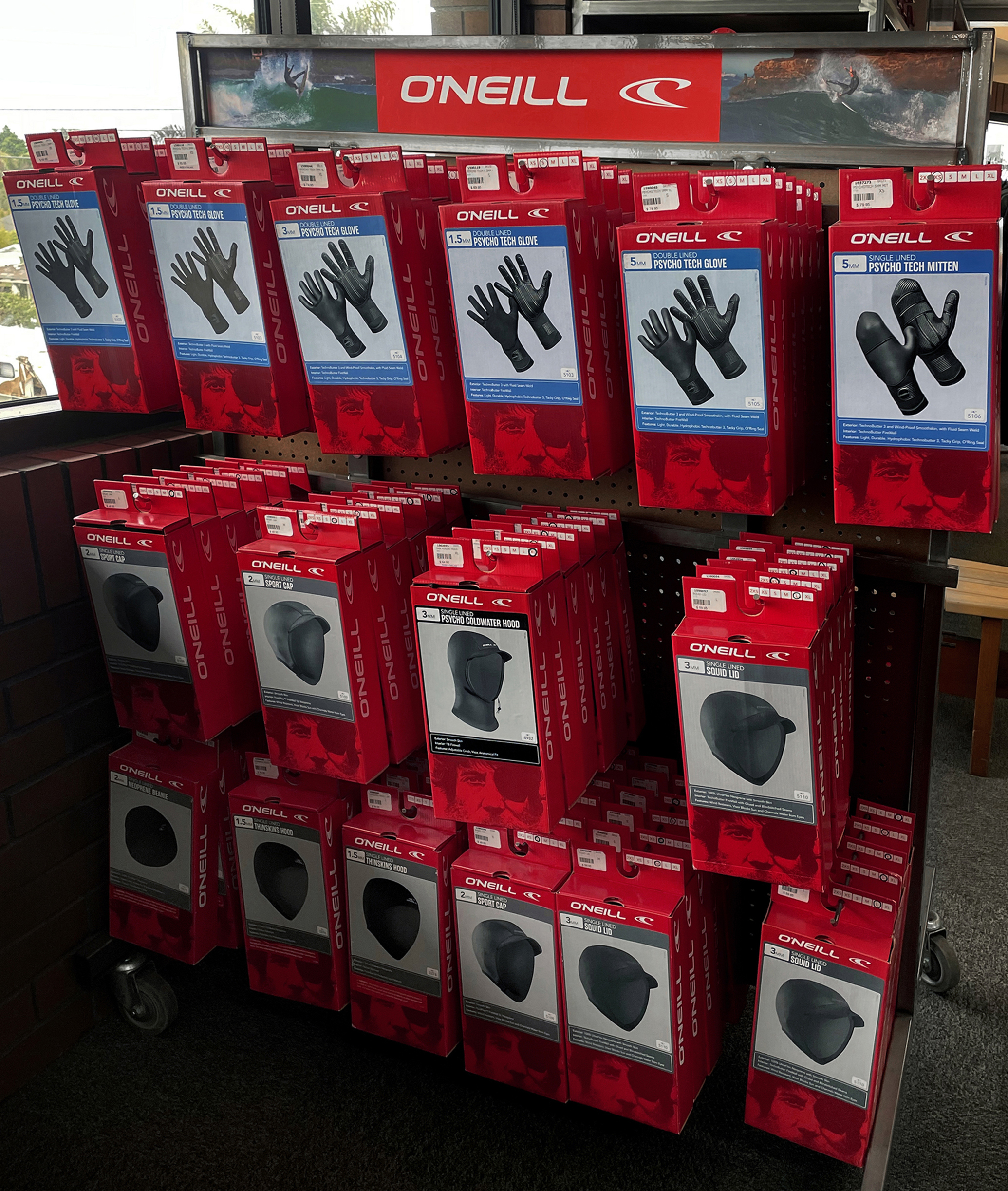The bold red combined with a tonal image of Jack O’Neill’s face transcends mere color choice—it embodies warmth, passion, courage, strength, and, most importantly, stopping power. This striking visual identity ensures the brand captures attention on retail shelves, setting it apart from competitors. The O’Neill logo is prominently featured, underscoring the brand’s rich legacy and established credibility.